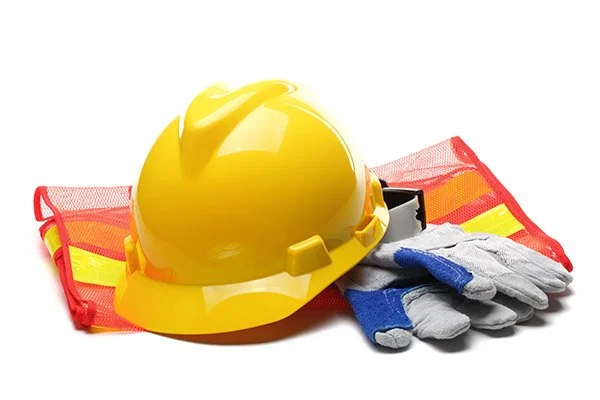 Yellow safety helmet, pair of work gloves, and a safety vest set on a white background.